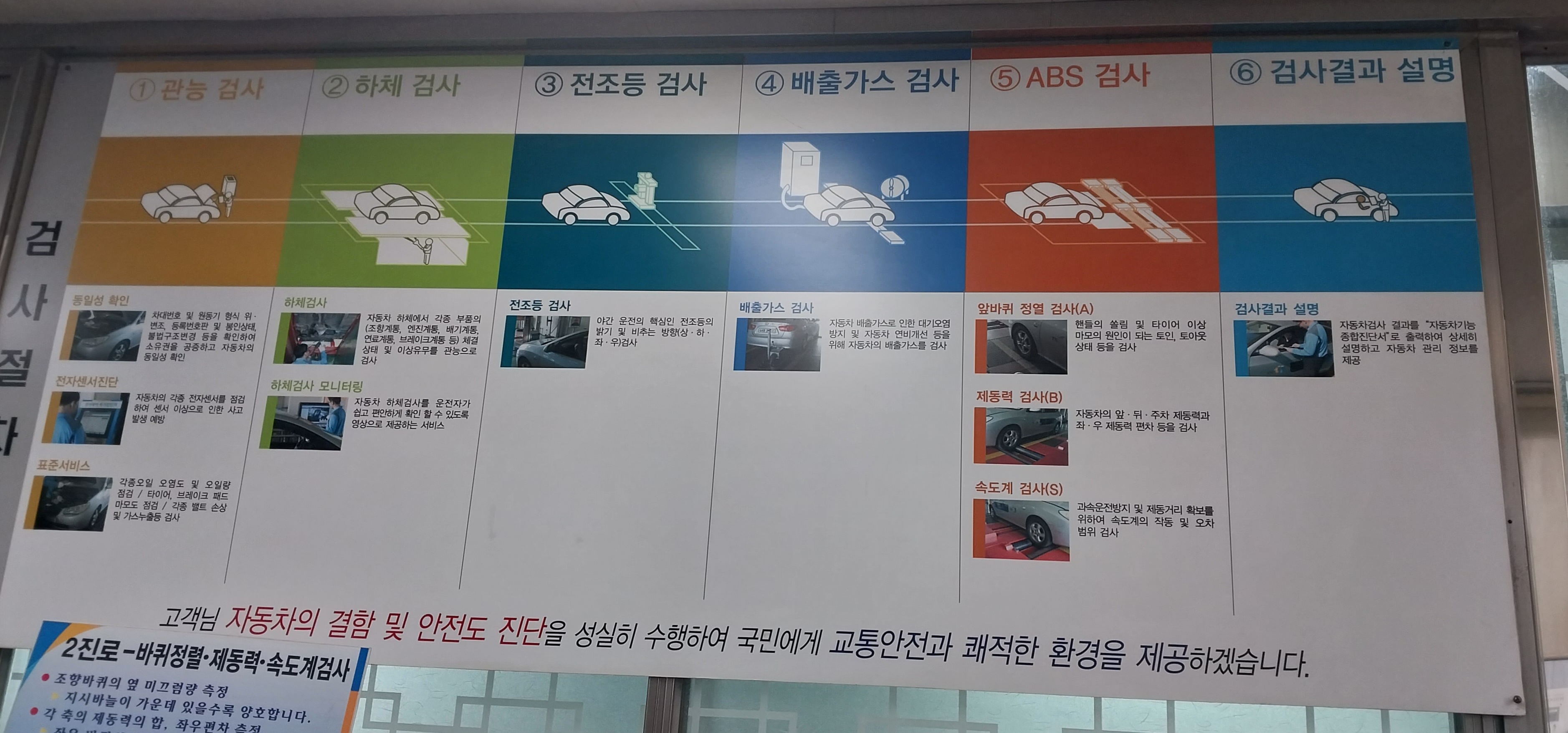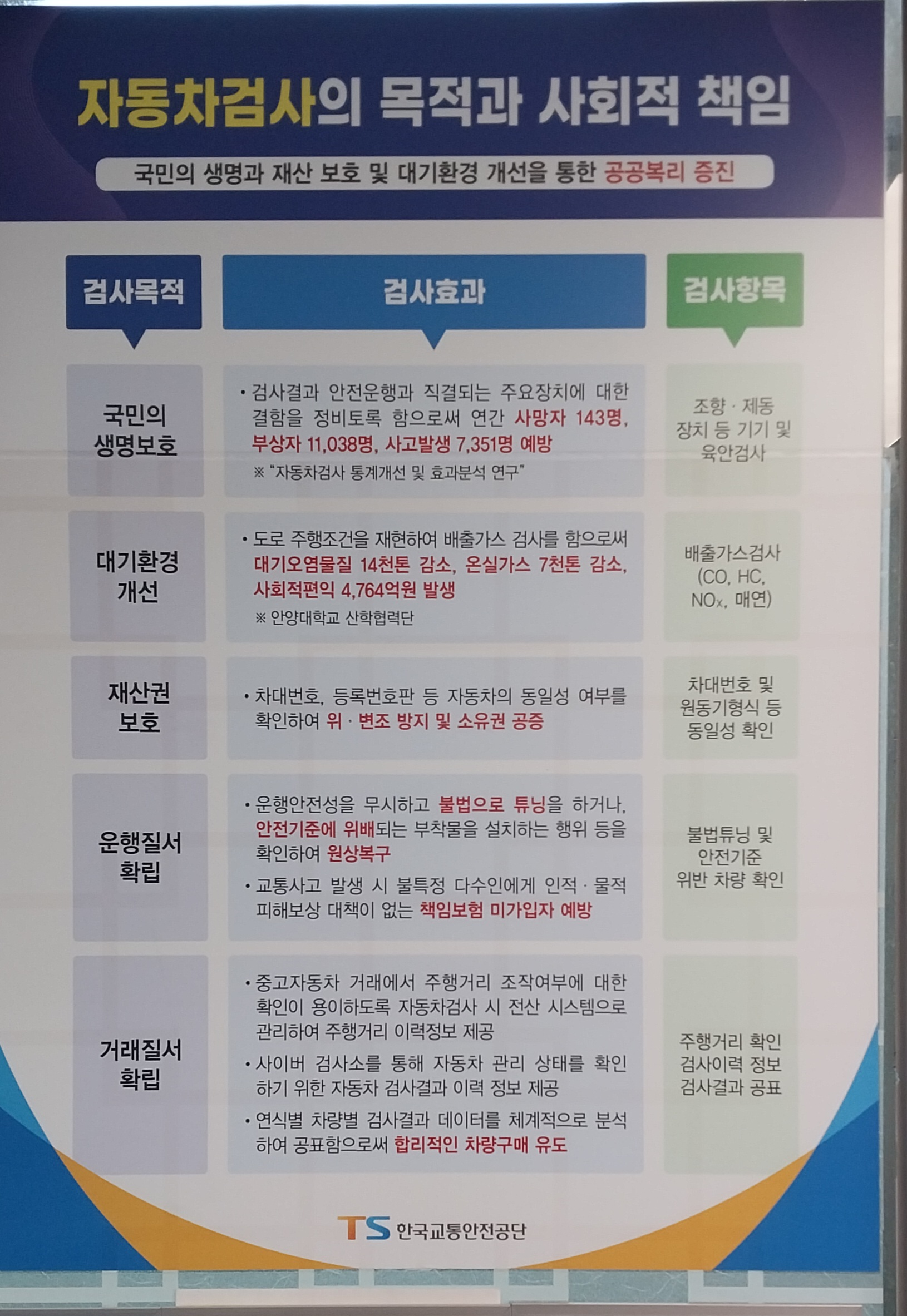타이어, 전조등, 깜빡이, 브레이크, 속도계, 타이밍 벨트, 배기 가스, 기타등등 운행에 중요한 기능들을 검사해서, 불의의 사고가 나지 않도록 하기위함인것 같습니다.