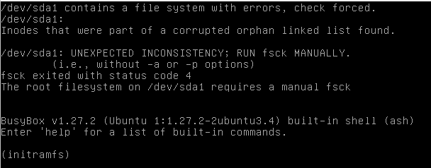 /dev/sda1: UNEXPECTED INCONSISTENCY; RUN fsck MANUALLY. (i.e., without a or -p options)