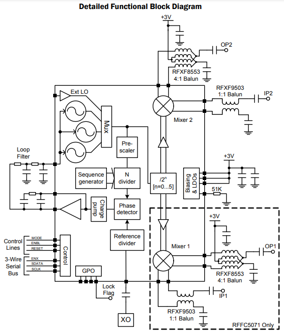 Qorvo's RFFC5072 is a reconfigurable frequency conversion device with integrated fractional-N phased locked loop (PLL) synthesizer, voltage controlled oscillator (VCO) and a high linearity mixer. The fractional-N synthesizer takes advantage of an advanced