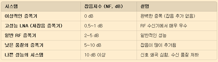 이상적인 시스템에서는 NF = 0 dB이지만, 실제 시스템에서는 항상 0 dB보다 큼