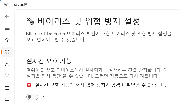 보안설정에서 실시간 보호 기능 끄니깐, 파일이 삭제되지는 않음.