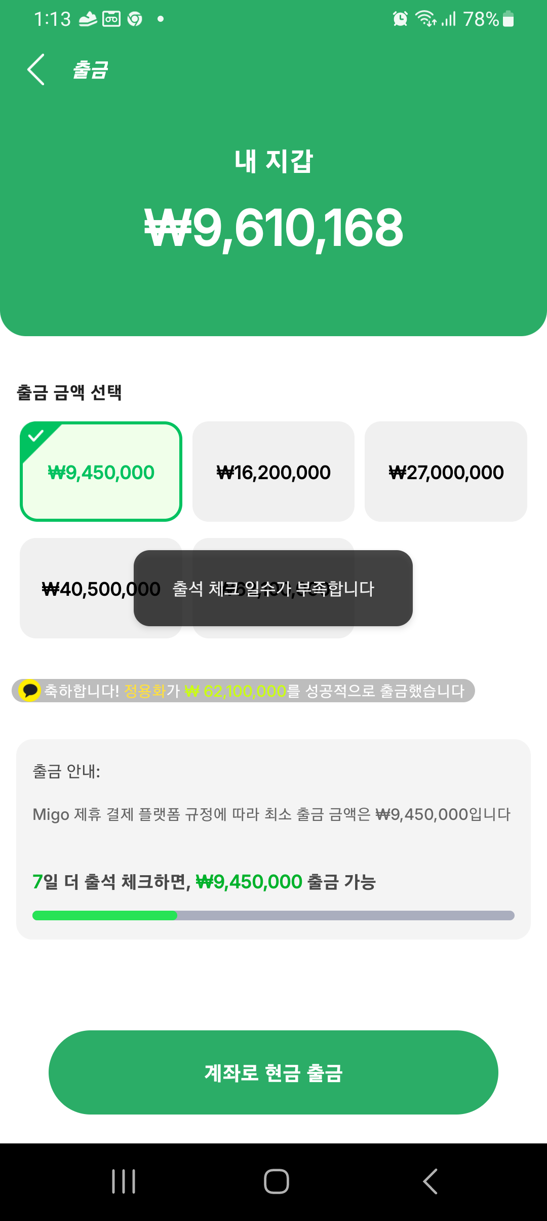 출금엑수 채우니, 1주일 채우라네...ㅎㅎ