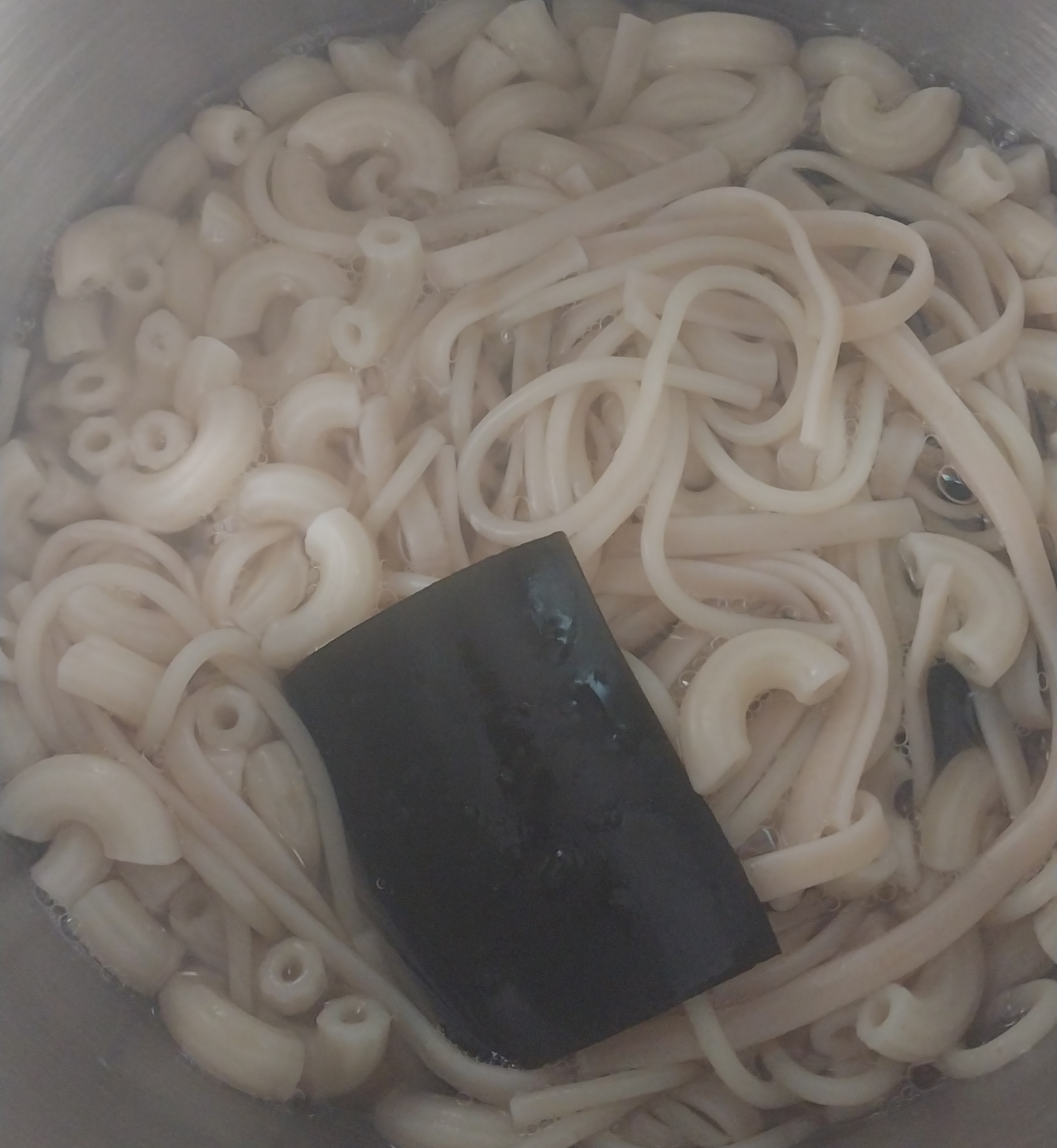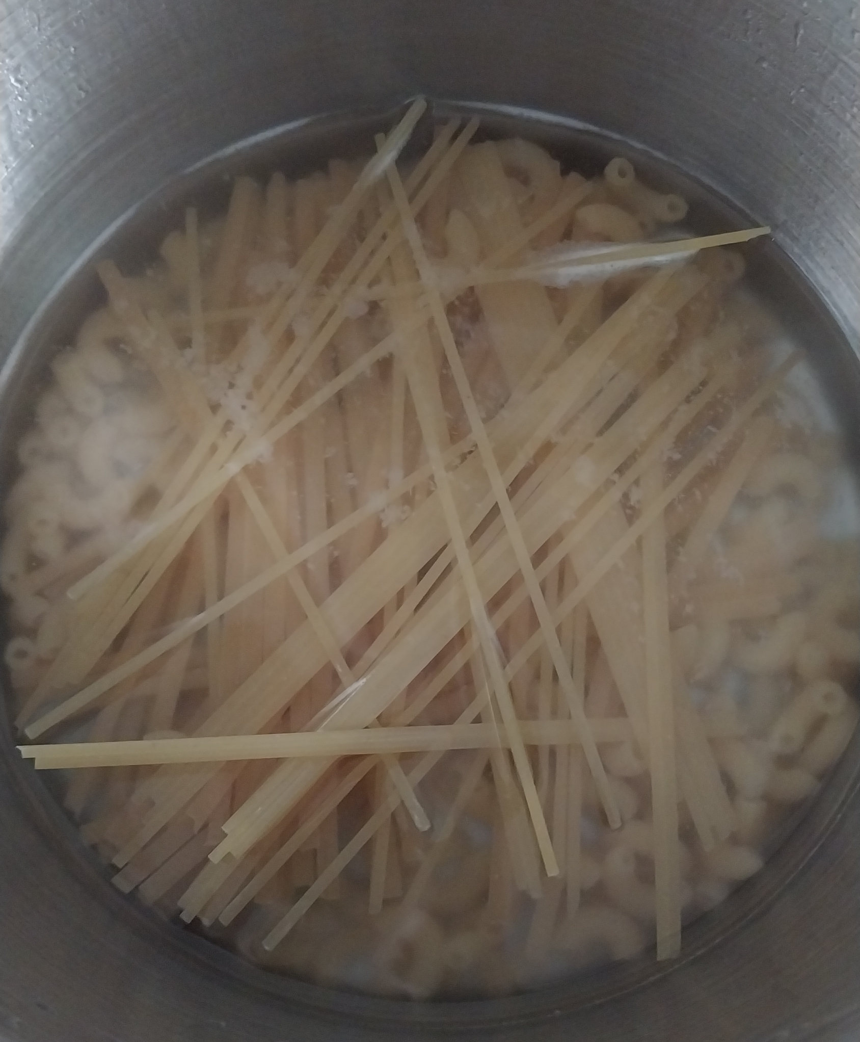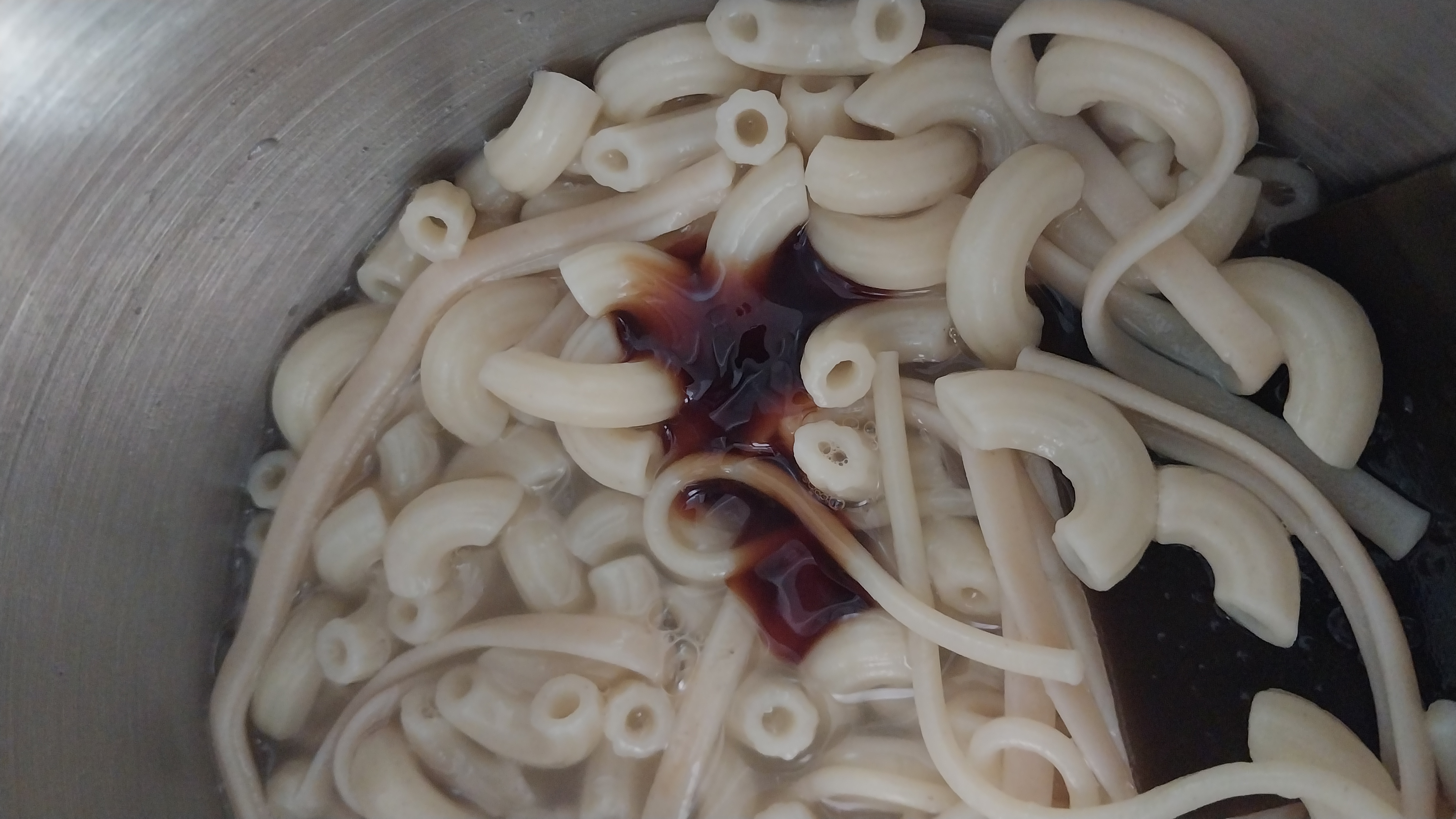 마카로니, 스파게티가 무거워, 가라 앉으니, 바닥에 약간 늘어 붙음.