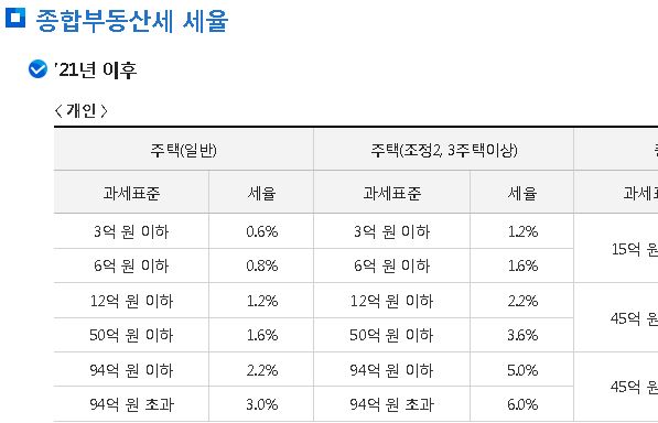 ’21년 이후(개인) - 주택(일반)(과세표준, 세율), 주택(조정2, 3주택이상)(과세표준, 세율), 종합합산토지분(과세표준, 세율), 별도합산토지분(과세표준, 세율) 포함주택(일반)주택(조정2, 3주택이상)종합합산토지분별도합산토지분과세표준세율과세표준세율과세표준세율과세표준세율