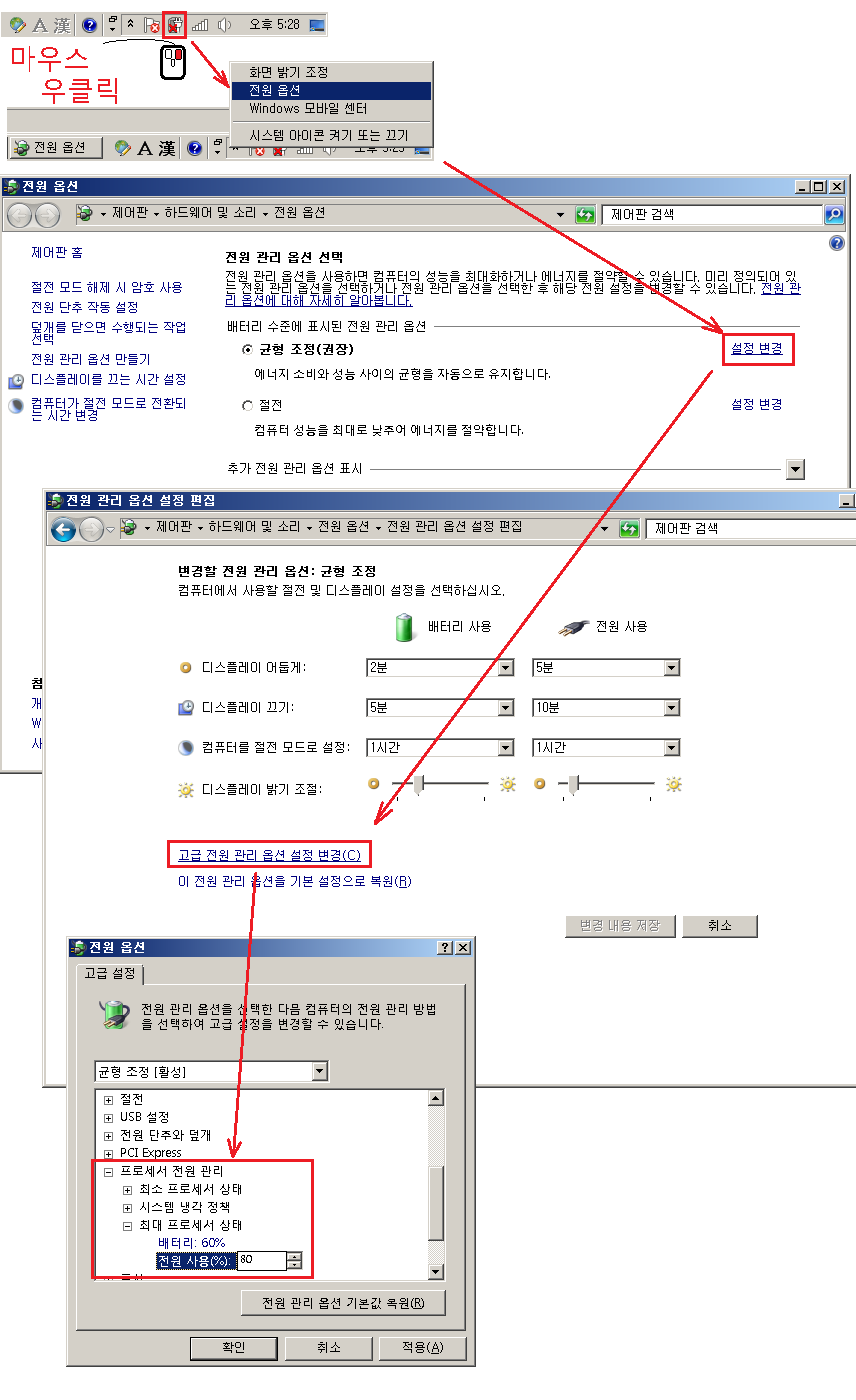 전원 옵션 창에서 프로세서 전원관리, 최대 프로세서 상태 전원사용 50% 정도