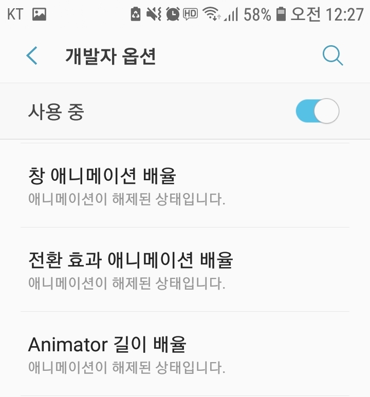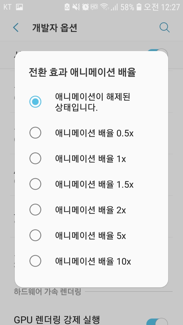 개발자 옵션에서 애니메이션 관련 항목 "해제"로 변경.(3개 메뉴)