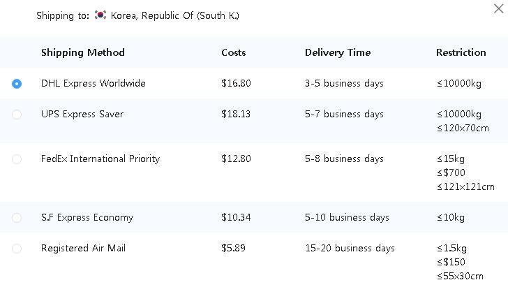 중국 Post 항공우편 배송시 약 8천원 싸지만, 배송이 1달 걸리 수 도 있음.