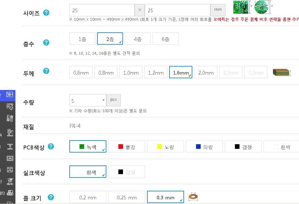 PCB두께는 가격에 조금 영향이 있고, 색상 변경은 약 2만원 올라가네요.