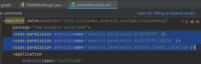 에러 메세지 : uses-sdk:minSdkVersion 16 cannot be smaller than version 19 declared in library [:flutter_blue]