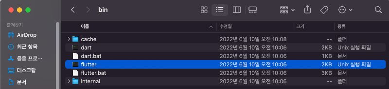 다운로드된 폴더 들어가서, bin폴더의 flutter (Unix 실행파일). 실행.
