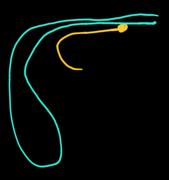 손으로 낚시줄 2개를 살짝 당길 수 있을 만한 길이.