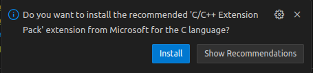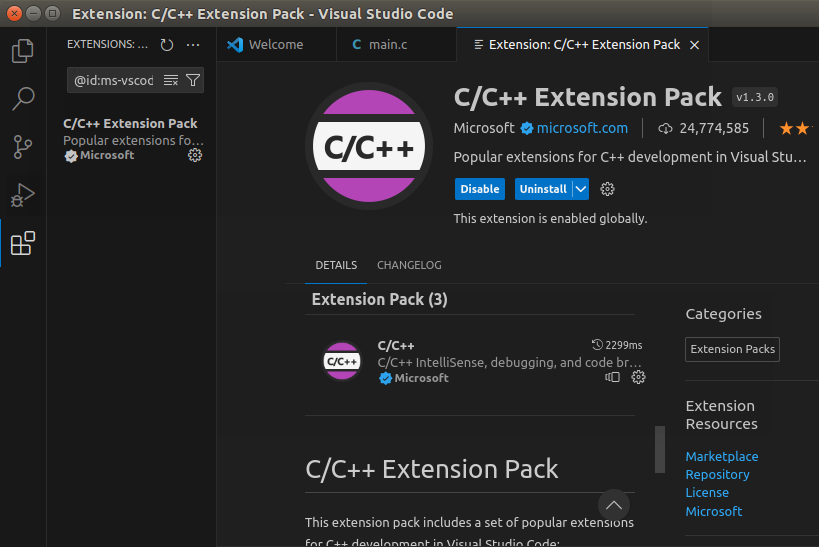 - "c/c++"를 검색하고 Microsoft에서 제공하는 "C/C++" 확장을 설치합니다.