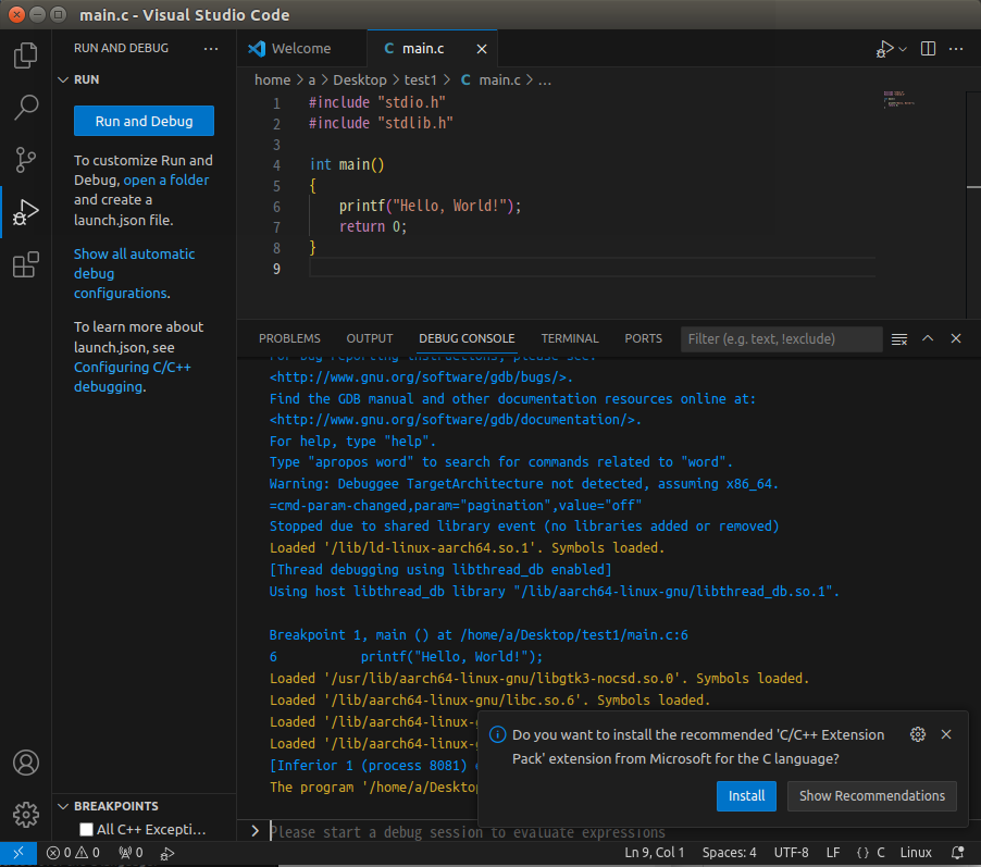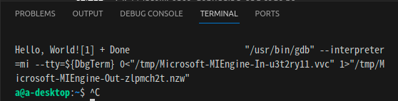 Hello, World![1] + Done "/usr/bin/gdb" --interpreter=mi --tty=${DbgTerm} 0<"/tmp/Microsoft-MIEngine-In-u3t2ry11.vvc" 1>"/tmp/Microsoft-MIEngine-Out-zlpmch2t.nzw" a@a-desktop:~$ |
