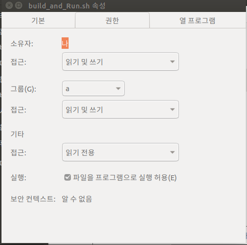 실행권한은 명령어로 줄 수 도 있고, GUI에서 마우스로 속성->권한->파일을 프로그램으로 실행 허용 체크 해주면 된다.
