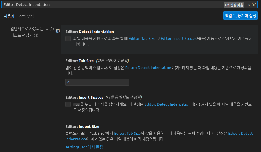 파일 -> 설정에서 "Editor: Detect Indentation" 검색