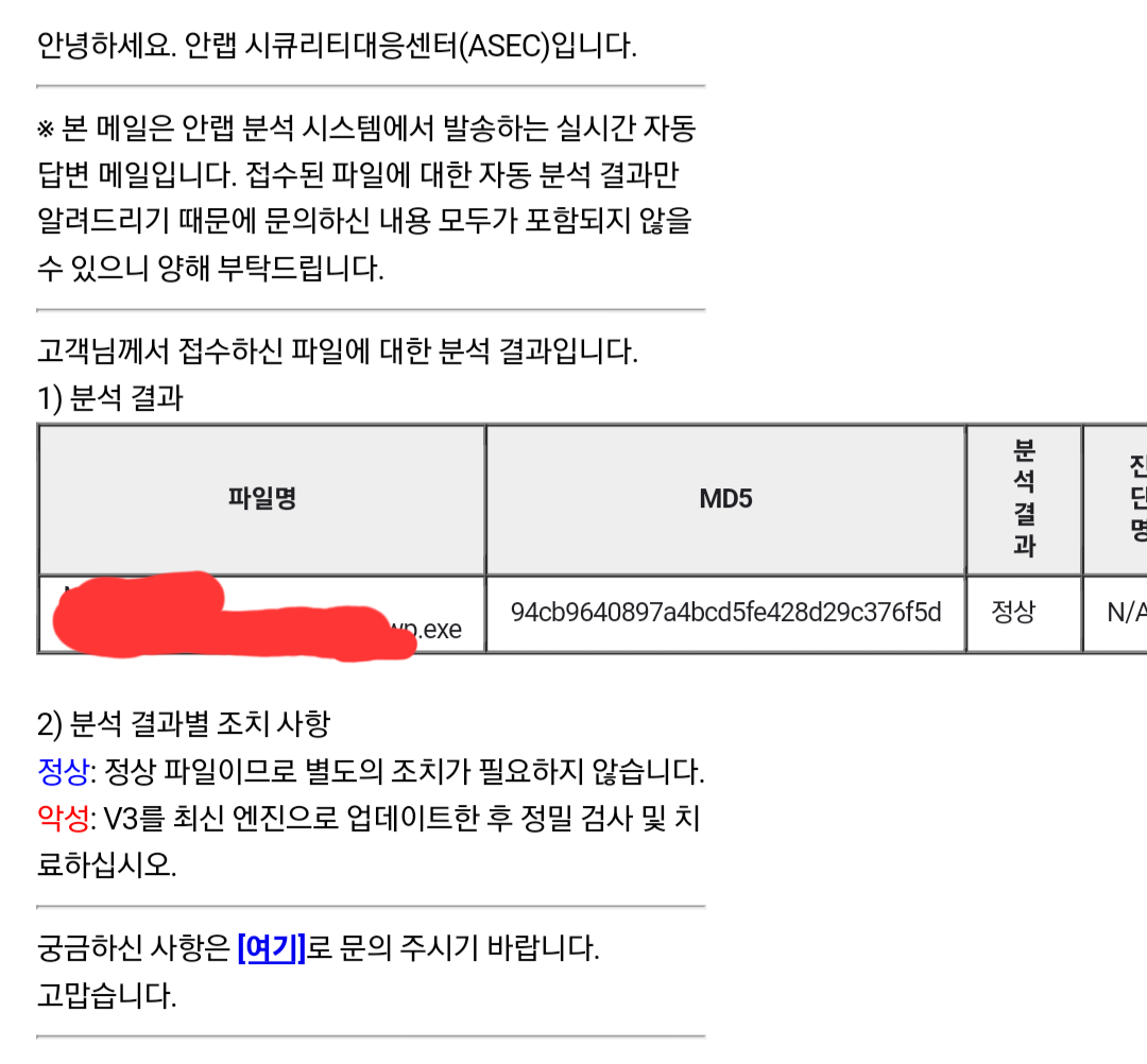 ※ 본 메일은 안랩 분석 시스템에서 발송하는 실시간 자동답변 메일입니다. 접수된 파일에 대한 자동 분석 결과만 알려드리기 때문에 문의하신 내용 모두가 포함되지 않을 수 있으니 양해 부탁드립니다.