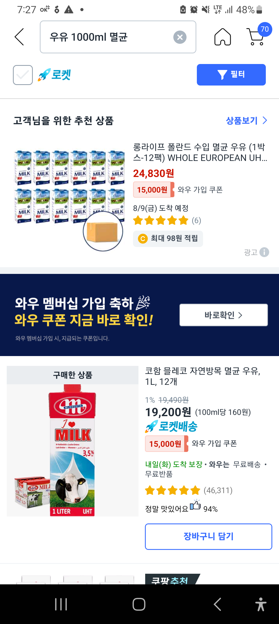 알리, 쿠팡 우유 가격비교