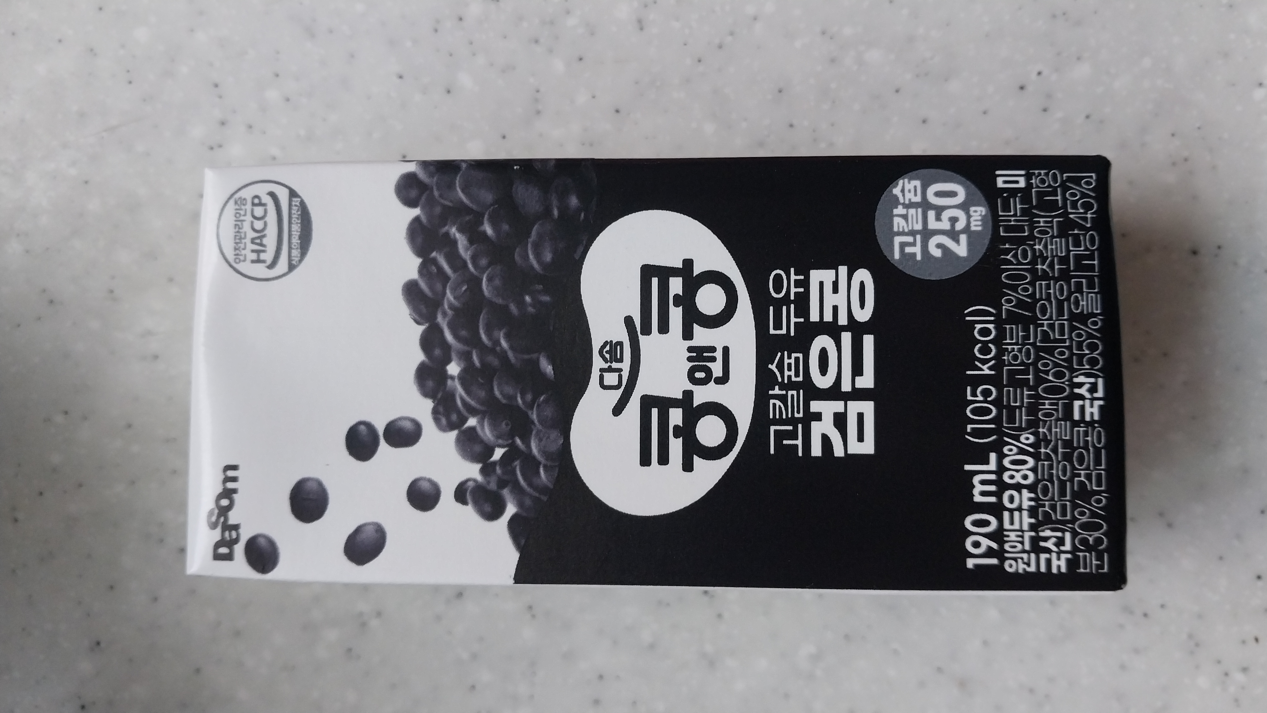 제품명: 공연동 고급습두유 검은콩·식품의 유 항: 가공두유(멸균제품)·소비기한: 상단부 표기 일까지 원재료명 및 함량: 원액두유 80% (두류 고형분 7% 이상, 대두: 미국산), 정제수, 정백당, 검은콩추출액 0.6% 검은콩추출액(고형분 30%, 검은콩: 국산)55%, 올리고당 45%, 탄산칼슘, 대 두레시틴, 정제소금(국산), 향료(땅콩항), 카라기 난, 비타민D혼합제제(아라비아검, 자당, 옥수수 전분, 가공유지, 이산화규소, 비타민D3, 비타민E)
