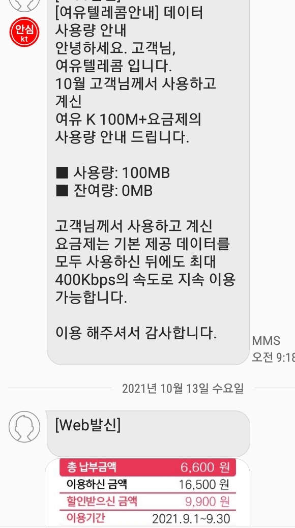여유텔레콤 여유 K 100M+ 요금제 (400kbps 무제한) 9월 청구서